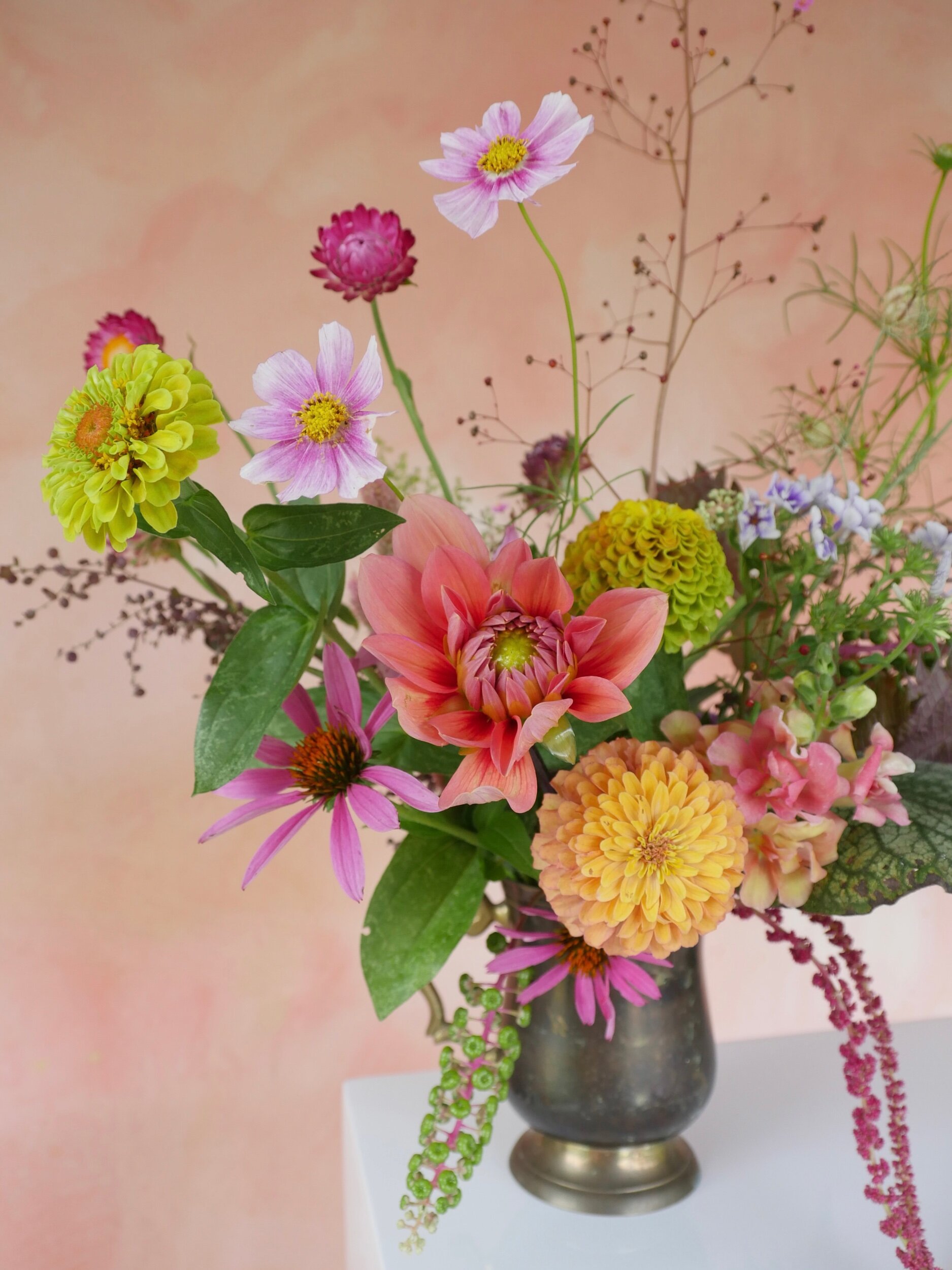 The flowers that you see here are created with my neighbors in mind. A beloved one is fighting cancer, another desperate for healing from an autoimmune disease that has plagued her for 10 years now. Another just went through a big move; and my neighbor who lives just a stone’s throw away is about to send her first child off to kindergarten. Selecting each stem—a prayer—and placing it delicately in their chosen vessels, was a plead for healing, freedom from anxiety and rest in the daily decisions that can sometimes feel overwhelming.